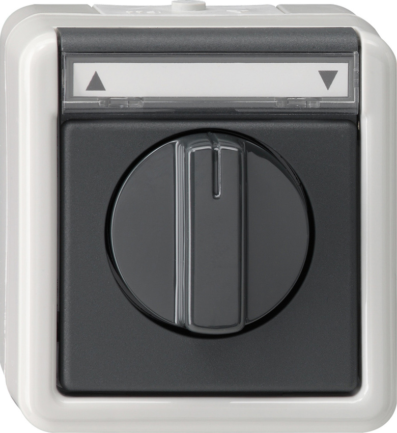 Jalousietaster bzw. -schalter 1-polig 10 AX 250 V~ mit Beschriftungsfeld Gruppentaster bzw. -schalter Grau Hinweise : Tasterfunktion bei Drehung des Knebels. Nach Entfernen der Messingarretierung Tasterfunktion bei kleiner Drehung des Knebels. Bei vollst_ndiger Drehung des Knebels rastet der Schalter ein.Blind 1-p WP SM GY Blind button or switch 1-pole 10 AX 250 V~ with inscription space Group button switch grey Notes : - Button function upon rotation of the toggle switch. After removing the brass locking mechanism, button function upon slight rotation of the knob. When fully rotating the knob, the switch engages.