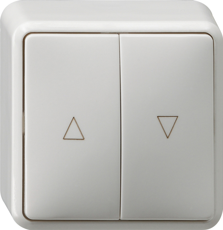 Wipp-Jalousietaster 10 AX 250 V~ mit Pfeilsymbolen Reinweiß Merkmale: Mit Sperre gegen doppelseitiges Einschalten. Elektrisch und mechanisch verriegelt.