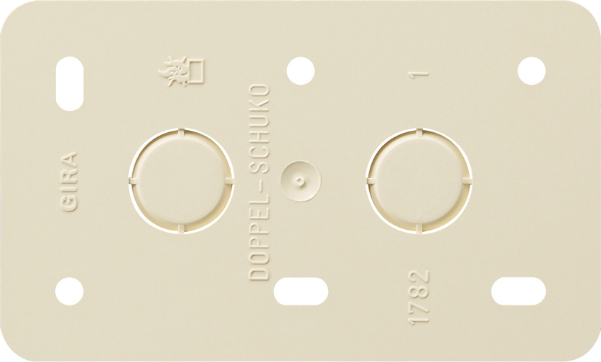Montageplatte zur Montage von Aufputz-Geräten 2fach für Doppelsteckdose Cremeweiß Merkmale: Montage z. B. auf Holzwänden. Schwer entflammbar.