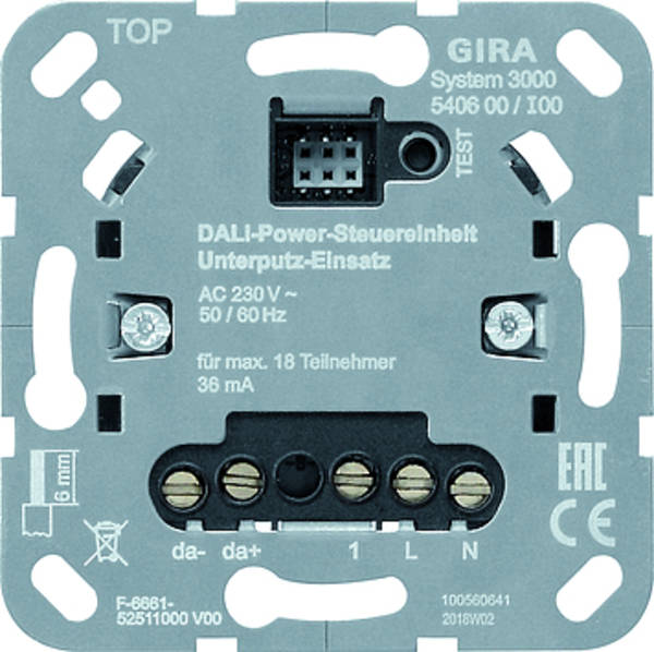 System 3000 DALI-Power-Steuereinheit Unterputz-Einsatz Merkmale: Schalten und Helligkeitseinstellung fŸr Leuchten mit DALI-Schnittstelle. Einstellung der Farbtemperatur fŸr Leuchten mit DALI Device Type 8 fŸr Tunable White gem_§ IEC 62386-209. Anschluss von Nebenstellen m_glich. DALI-Spannungsversorgung fŸr 18 DALI-Teilnehmer. Parallelschalten von bis zu 4 DALI-Power-Steuereinheiten um bis zu 72 DALI-Teilnehmer zu versorgen. Speichern der Minimalhelligkeit, der k_ltesten und der w_rmsten Farbtemperatur. Einschalten mit zuletzt eingestellter Helligkeit Farbtemperatur oder gespeicherter Helligkeit Farbtemperatur. Mit System 3000 Bedienaufsatz 2fach: Einstellung der Farbtemperatur Ÿber rechte Wippe.S3000 DALI Pow.CU FM ins. Ins. Gira System 3000 DALI power control unit, flush-mounted insert Features: - For switching on off and adjusting brightness for lights with a DALI interface - Adjustment of colour temperature for lights with DALI Device Type 8 for Tunable White according to IEC 62386-209. - Connecting auxiliary units is possible. - DALI power supply for 18 DALI devices. - Parallel connection of up to 4 DALI Power control units to supply up to 72 DALI devices. - Save the minimum brightness, the coolest and warmest colour temperature. - Switch on with the last brightness colour temperature set, or a saved brightness colour temperature.