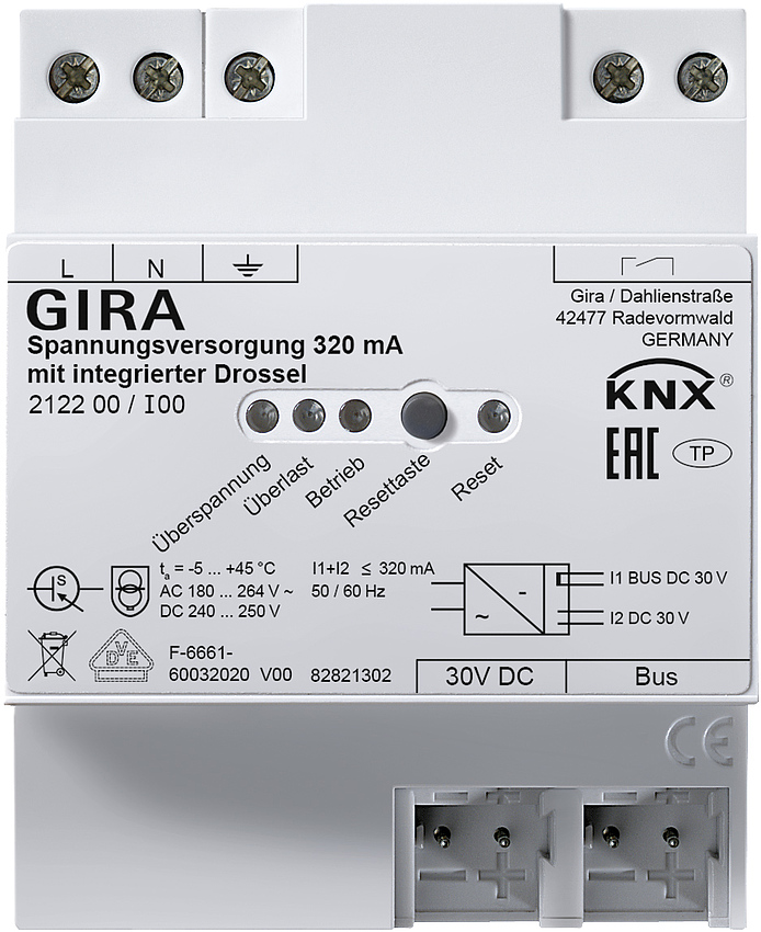 KNX Spannungsversorgung 320 mA mit integrierter Drossel Spannungsversorgungen zur Versorgung von KNX Ger_ten mit Busspannung. Merkmale: Ausgang mit integrierter Drossel zur Versorgung von KNX Buslinien. Ausgang DC 30 V zur Versorgung zus_tzlicher Ger_te. Nennstrom beliebig auf die Ausg_nge aufteilbar. Reset-Taster. Kurzschlussfest. †berspannungsfest. Leerlaufsicher. Geeignet fŸr Betrieb in Anlagen mit Notstromversorgung. Potenzialfreier Meldekontakt fŸr Betriebs- und Diagnosemeldung. Zwei typgleiche KNX Spannungsversorgungen zur Leistungserh_hung direkt parallel schaltbar. Hinweise : Montage auf DIN-Hutschiene. VDE-Zulassung gem_§ EN 60669-1, EN 60669-2-1.PS 320mA choke DRA KNX KNX power supply 320 mA with integrated choke Power supplies for supplying KNX devices with bus voltage. Features: - Output with integrated choke to supply KNX bus lines. - Output DC 30 V to supply additional devices. - Rated current can be flexibly split up amongst outputs. - Reset button. - Short-circuit-proof. - Overvoltage protection. - Open circuit-proof. - Suitable for operation in systems with emergency power supply. - Isolated signal contact for operating message and diagnostic message. - Two KNX power supplies of the same type can be connected in parallel. Notes : - Installation on DIN top-hat rail. - VDE approval in accordance with EN 60669-1, EN 60669-2-1.