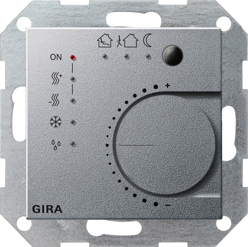 KNX Stetigregler mit Tasterschnittstelle 4fach System 55 Farbe Alu Die Stetigregler Unterputz und die Objektregler vereinen die Funktionen eines KNX Busankopplers, eines Einzelraum-Temperaturreglers mit Sollwertvorgabe und die eines Bin_reingangs. Merkmale: An den Bin_reingang k_nnen vier potenzialfreie Kontakte angeschlossen werden. Der Eingang 1 kann zum Anschluss eines FernfŸhlers fŸr die Temperaturmessung im Fu§boden benutzt werden. Zwei Eing_nge sind als Ausg_nge (max. 0,8 mA) parametrierbar. Die Reglerfunktion dient zur Einzelraum-Temperaturregelung. Der Regler erfasst mit einem internen bzw. externen TemperaturfŸhler die aktuelle Raumtemperatur und verarbeitet diese mit einem einstellbaren Temperatursollwert zu einer Stellgr_§e. Es k_nnen damit Stellantriebe mit stetigem Stellsignal als auch mit schaltendem Stellsignal angesteuert werden. Regler: 5 Betriebsarten: Komfort, Stand-by, Nacht, Frost- bzw. Hitzeschutz und Reglersperre (z. B. Taupunkt-Betrieb). Heiz- KŸhlfunktionen: Heizen, KŸhlen, Heizen und KŸhlen, Grund- und Zusatzheizen, Grund- und ZusatzkŸhlen. Voreingestellte Regelparameter fŸr g_ngige Heiz- bzw. KŸhlk_rper. Regler abschaltbar (Taupunktbetrieb) bzw. Regler oder Bedienung des Reglers sperrbar. Ventilschutzfunktion (Ventil wird zyklisch alle 24 Stunden ge_ffnet). Regelungsarten: Stetige PI-Regelung, schaltende PI-Regelung (PWM) und schaltende 2-Punkt-Regelung (Ein Aus). Temperaturerfassung Ÿber einen internen und oder externen FŸhler (Mittelwertbildung fŸr gro§e R_ume). Eing_nge: Freie Zuordnung der Funktionen Schalten, Dimmen, Jalousie und Wertgeber zu den Eing_ngen. Sperrobjekt zum Sperren einzelner Eing_nge. Verhalten bei Busspannungswiederkehr fŸr jeden Eingang separat parametrierbar. Telegrammratenbegrenzung. Funktion Schalten: zwei unabh_ngige Schaltobjekte fŸr jeden Eingang vorhanden und einzeln freischaltbar, Befehl bei steigender und fallender Flanke unabh_ngig einstellbar (EIN, AUS, UM, keine Reaktion). Funktion Dimmen: Einfl_chen- und Zweifl_chenbedienung, Zeit zwischen Dimmen und Schalten und Dimmschrittweite einstellbar, Telegramm-Wiederholung und Stopp-Telegramm senden m_glich. Funktion Jalousie: Befehl bei steigender Flanke einstellbar (keine Funktion, AUF, AB, UM), Bedienkonzept parametrierbar (Step - Move - Step bzw. Move - Step), Zeit zwischen Kurz- und Langzeitbetrieb einstellbar, Lamellenverstellzeit einstellbar. Funktion Wertgeber und Lichtszenennebenstelle: Flanke (Taster als Schlie§er, Taster als …ffner, Schalter) und Wert bei Flanke parametrierbar, Wertverstellung bei Taster Ÿber langen Tastendruck fŸr Wertgeber m_glich, Lichtszenennebenstelle mit bzw. ohne Speicherfunktion. Funktion TemperaturfŸhler: Ein Kanal der Tasterschnittstelle kann als externer TemperaturfŸhler fŸr den Raumtemperaturregler genutzt werden. Ausg_nge: Unabh_ngiges Schalten der max. zwei Ausg_nge. Mit dem Stellrad wird der Temperatursollwert verschoben. Ein Pr_senztaster dient zur Umschaltung zwischen Komfort- und Stand-by-Betrieb. Die aktuellen Zust_nde werden am Stetigregler durch LEDs angezeigt. Hinweise : Es ist kein separater Busankoppler notwendig. Bei Anschluss der externen Eing_nge wird die Verwendung einer Schalterklemmdose empfohlen.KNX c.cont.btn I F 4g Sys55 CAl KNX continuous controller with button interface, 4-gang System 55 colour aluminium The flush-mounted continuous controllers and the object controllers combine the functions of a KNX bus coupler, a single-room temperature controller with specified setpoint value, and a binary input. Features: - Four zero-voltage contacts can be connected to the binary input. - Input 1 can be used to connect a remote sensor for the temperature measurement in the floor. - Two inputs can be configured as outputs (max. 0.8 mA) - The control function is used for single-room temperature control. The controller detects the current room temperature with an internal or external temperature sensor and computes an adjustment size using it and an adjustable temperature setpoint value. Valve drives can be controlled with a constant adjustment signal or with a switching adjustment signal here. Controller: - 5 operating modes: Komfort, standby, night, frost or heat protection, and controller lock-out (e.g. dew-point mode). - Heating cooling functions: Heating, cooling, heating and cooling, basic and additional heating, basic and additional cooling. - Preset control parameters for common radiators or cooling units. - Controller deactivatable (dewpoint operation) or controller or operation of the controller can be blocked. - Valve protection function (valve is opened cyclically every 24 hours). - Control types: Continuous PI control, switching PI control (PWM), and switching 2-point control (on off) - Temperature detection via an internal and or external sensor (average value calculation for large areas). Inputs: - Free assignment of the functions switching, dimming, blind and value transmitter to the inputs. - Blocker for blocking individual inputs. - Behaviour upon bus voltage recovery can be configured separately for each input. - Telegram rate limit. - Switching function: two independent switching objects are available for each existing input and can be enabled individually, command for leading and trailing edge can be set independently (ON, OFF, CHANGE, no reaction). - Dimming function: single-surface and double-surface operation, time between dimming and switching, and dim-step size can be set, telegram repetition and stop telegram transmission possible. - Blind function: Command can be set with rising edge (no function, UP, DOWN, CHANGE), operating concept can be configured (Step - Move - Step or Move - Step), time between short and long-term operation can be set, slat adjustment time can be set. - Value transmitter and light scene auxiliary unit function: edge (button as NO contact, button as NC contact, switch) and value with edge can be configured, value adjustment by pressing and holding a button for v