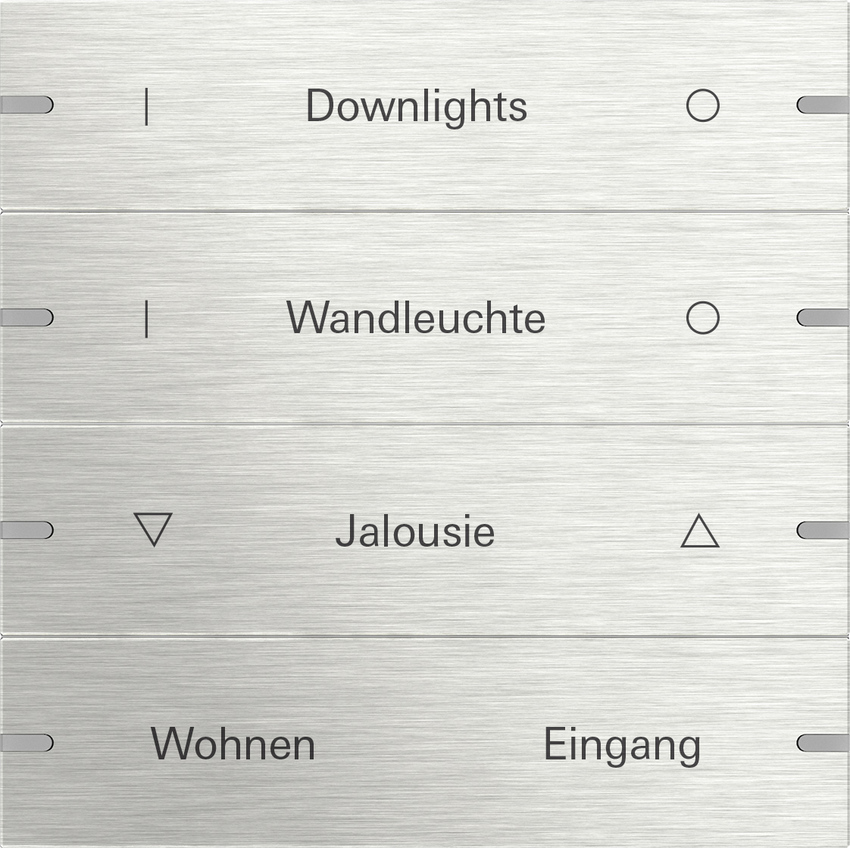 Wippenset 4fach individuell fŸr Tastsensor 4 Edelstahl Hinweise : Beschreibbare Wippensets k_nnen mit einer individuellen Beschriftung versehen werden. Die Bestellung wird Ÿber den Gro§handel abgewickelt, der beim Bestellvorgang der Wippen angegeben wurde. Dieses Produkt kann ausschlie§lich Ÿber den Gira Beschriftungsservice bestellt werden. Professionelle Beschriftung Ÿber den Gira Beschriftungsservice www.beschriftung.gira.de.