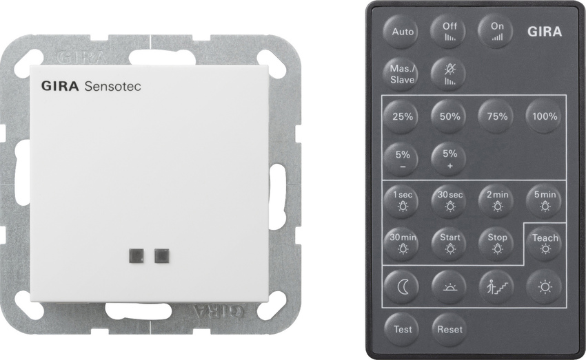 Sensotec System 55, mit Fernbedienung Reinwei§ gl_nzend Die Erfassung nutzt den Dopplereffekt, _hnlich der Geschwindigkeitsmessung im Stra§enverkehr. Die Bewegungserfassung kann auch durch nicht abschirmende Materialien erfolgen. So k_nnten z. B. Toilettenanlagen mit einem einzigen Sensotec abgedeckt werden. Merkmale: BerŸhrungsloses Schalten verhindert Verschmutzung. Eine Kontaminierung durch Viren und Bakterien durch den Benutzer wird dadurch ausgeschlossen. Die Erfassung im Nah- und Fernbereich ist Abh_ngig von der Reflexionsfl_che, der Geschwindigkeit und Art des Objekts (Person, Tier, Gegenstand usw.). Metallrahmen beeinflussen den Erfassungsbereich. Erweiterung des Erfassungsbereichs durch Nebenstellen. Nebenstellenbedienung mit Wipptaster. Ben_tigt eine IR-Fernbedienung zur Inbetriebnahme und Einstellen verschiedener Funktionen. Individueller Helligkeitswert und Nachlaufzeit m_glich (Teach-Funktion). Empfindlichkeit der Fernerfassung ist einstellbar. Montage in tiefe Ger_tedose. ErfŸllt die Vorgaben der Richtlinie VDI VDE 6008 Blatt 3. Der Sensotec ist ein aktiver Bewegungsmelder. Er erfasst temperaturunabh_ngig Bewegungen im Erfassungsbereich und schaltet die Raumbeleuchtung, abh_ngig von der Umgebungshelligkeit, gedimmt ein. Bewegung im Nahbereich schaltet die Raumbeleuchtung ungedimmt ein. Einschalthelligkeit der Raumbeleuchtung bei Fernerfassung einstellbar. Hinweise : Zur Inbetriebnahme und zum Einstellen verschiedener Funktionen ist eine IR-Fernbedienung erforderlich.Sensotec rem.ctrl. Sys55 PW Sensotec System 55, with remote control pure white glossy Detection utilises the doppler effect, similar to traffic speed measurement. Detection is also possible with non-shielding material. For example, sanitary facilities could be covered with a single Sensotec in this way. Features: - Contactless switching prevents soiling. This rules out contamination with viruses or bacteria by the user. - Detection in the close-up and long range depends on the reflecting surface, speed, and type of the object (person, animal, object, etc.). - Metal frames affect the detection range. - Extension of detection range through auxiliary units. - Auxiliary input operation with rocker button. - Requires an IR remote control to start up and set various functions. - Individual brightness value and delay time is possible (teach function)- - The sensitivity of the far-field detection is adjustable. - Installation in a deep device box. - Fulfils the specifications of the guidelines in VDI VDE 6008 Sheet 3. - The Sensotec is an active motion detector. It detects motion in the detection range regardless of the temperature and switches on room lighting dimmed based on the ambient brightness. - Motion in the close-up range switches on the room lighting undimmed. - Switch-on brightness of the room lighting can be set for far-field detection. Notes : - IR remove control is required during start-up and for configuring various functions.