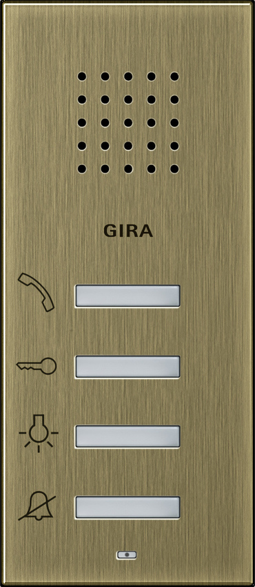 Wohnungsstation AP System 55 Bronze Merkmale: Komplett vormontierte Wohnungsstation AP. Dadurch schnelle und saubere Montage m_glich. Designvielfalt durch Integration in das Schalterprogramm, dadurch einheitliches Erscheinungsbild von TŸrkommunikation und Elektroinstallation. Montage sowohl mit als auch ohne Abdeckrahmen. Einfache Montage durch steckbare Schraubklemmen auf der Montageplatte. Die Kontaktierung zur Wohnungsstation erfolgt beim Aufstecken der Wohnungsstation auf die Montageplatte. Einfache Demontage der Wohnungsstation bei Renovierungsarbeiten. Befestigungsl_cher fŸr die Montage. SignalŸbertragung und Versorgung der Wohnungsstation Ÿber verpolungssicheren und kurzschlussfesten 2-Draht-Bus. Parallelschaltung von bis zu drei Wohnungsstationen m_glich (bei Spannungsversorgung Ÿber 2-Draht-Bus). Einmann-Inbetriebnahme durch einfache Inbetriebnahme-Prozedur. Ruftonunterscheidung zwischen TŸrruf, Internruf und Etagenruf. Auswahl von fŸnf verschiedenen Rufmelodien, die einzelnen Ruftasten individuell zugeordnet werden k_nnen. Freisprechfunktion (sprachgesteuertes Gegensprechen mit Echo- und Hintergrund-ger_uschunterdrŸckung). Durchsetzfunktion bei lauten Hintergrundger_uschen w_hrend der Sprechverbindung. Mith_rsperre. Bedientasten mit integrierten Leuchtdioden zur Zustandsanzeige. Die Bedientasten der Wohnungsstation AP steuern die folgenden Funktionen in Verbindung mit dem Schaltaktor oder dem Unterputz-Schaltaktor:: Schalten von Licht und anderen Funktionen. Ansteuerung des TŸr_ffners. Einstellen der Rufmelodie. Rufton ein- und ausschalten. Rufannahme. Aktivierung der Durchsetzfunktion. Einstellung von Rufton- und Sprechlautst_rke. Hinweise : Montage ohne Abdeckrahmen m_glich. Bei Montage in Verbindung mit System 55 oder den Schalterprogrammen Fl_chenschalter und Gira E22 ist ein Abdeckrahmen 2fach ohne Mittelsteg erforderlich. Bei der Montage auf eine Ger_tedose ist ein Abdeckrahmen erforderlich Mit dieser Komponente ist der Aufbau von TŸrkommunikationsanlagen mit bis zu 70 Teilnehmern m_glich (z. B. 1 x Einbaulautsprecher, 5 x Erweiterungsmodul fŸr Einbaulautsprecher, 68 x Wohnungsstation AP).SM home st. Sys55 BZ Surface-mounted home station System 55 bronze Features: - Completely pre-assembled surface-mounted home station This facilitates fast and clean installation. - Design diversity thanks to integration into the design line, allowing uniform appearance of door communication and electrical installation. - Installation possible with or without frame. - Easy installation with plug-in screw terminals on the mounting plate. Contact to the home station is established when the home station is attached to the mounting plate. - Easy disassembly of the home station during renovation work. - Mounting holes for installation. - Signal transmission and power supply of home station via reverse-polarity-protected and short-circuit-proof 2-wire bus. - Parallel connection of up to three home stations is possible (with power supply via the 2-wire bus). - One-man start-up with easy start-up procedure. - Ringtone differentiation for door call, internal call and floor call. - Choice of five different ringtone melodies for separate assignment to specific call buttons. - Speakerphone function (voice-controlled talk-back with echo and background noise suppression). - Enforcement function for loud background noises during the voice connection. - Eavesdropping prevention. - Operating buttons with integrated LEDs for status display. The operating buttons of the surface-mounted home station control the following functions in connection with the switching actuator or the flush-mounted switching actuator:: - Switching of lights and other functions. - Control of the door opener. - Setting the ringtone melody. - Switching the ringtone on and off. - Call acceptance. - Activation of the enforcement function. - Adjustment of ring tone and voice volume. Notes : - Installation without frame is possible. - A 2-gang cover frame without crossbar is required for installation with System 55 or the Gira F100 and Gira E22 design lines. - A frame is required for installation in a device box - This component enables door communication systems with up to 70 devices to be set up (e.g. 1 x built-in speaker, 5 x add-on modules for built-in speakers, 68 x surface-mounted home stations).
