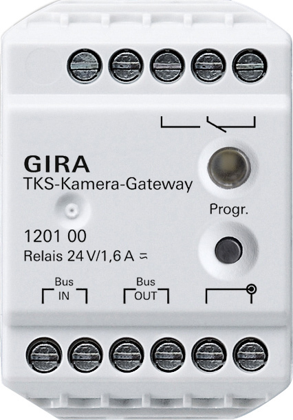 TKS-Kamera-Gateway Merkmale: Das TKS-Kamera-Gateway bindet eine handelsŸbliche analoge Kamera in das Gira TŸrkommunikations-System ein. Die Kamera kann einer TŸrstation zugeordnet werden. In diesem Fall schaltet sich die externe Kamera bei Bet_tigung der Ruftaste automatisch ein. Durch das Kombigeh_use des TKS-Kamera-Gateways sind drei Montagearten m_glich: Aufputz (in einer handelsŸblichen Abzweigdose). Unterputz (in eine Ger_tedose). als REG-Ger_t (mit dem beiliegenden REG-Adapter) Hinweise : Bei mehreren externen Kameras wird fŸr jede externe Kamera jeweils ein TKS-Kamera-Gateway und eine eigene Spannnungsversorgung ben_tigt. In einer Anlage dŸrfen bis zu zehn TKS-Kamera-Gateways eingesetzt werden, wobei das Videosignal max. drei TKS-Kamera-Gateways durchlaufen darf. Der Anschluss der externen Kamera erfolgt Ÿber Schraubklemmen.DCS-camera gateway Door DCS-camera gateway Features: - The DCS-camera gateway integrates a common analogue camera into the Gira door communication system. - The camera can be assigned to a door station. In this case, the external camera switches on automatically when the call button is pressed. The combination housing of the DCS-camera gateway makes three mounting types possible:: - Surface-mounted (in a standard junction box). - Flush-mounted (in a device box). - As a DRA device (with the included DRA adapter) Notes : - With several external cameras, a DCS-camera gateway and a separate power supply is required for each external camera. - Up to ten DCS-camera gateways can be used in a system, although the video signal may only run through a maximum of three DCS-camera-gateways. - The external camera is connected with screw terminals.