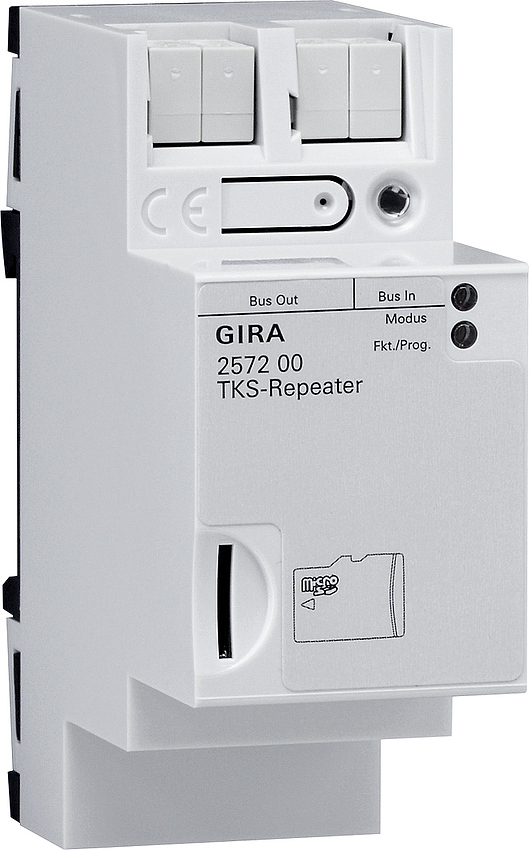 TKS-Repeater REG Merkmale: Aktive Komponente zur Erweiterung einer Gira TŸrkommunikationsanlage mit Audio- und Videofunktion. Reichweitenverl_ngerung und Erh_hung der Teilnehmerzahlen bei Verwendung weiterer Steuerger_te. Verst_rkung der Audio- und Datensignale des TŸrkommunikations-Systems in beide Richtungen. Repeatermodus: Verbindet zwei Liniensegmente miteinander, zur Verdopplung der Teilnehmerzahl einer Video- oder Audio-TŸrkommunikationsanlage und der Leitungsreichweite. Wichtig: FŸr die Versorgung des zweiten Liniensegments ist ein zus_tzliches Steuerger_t erforderlich. Mehrgespr_chsmodus: Im Mehrgespr_chsmodus wird die gesamte Anlage auf mehrere Linien (eine Hauptlinie, bis zu fŸnf Nebenlinien) aufgeteilt, welche Ÿber TKS-Repeater miteinander verbunden werden. Jede Linie wird von einem eigenen Steuerger_t versorgt. Im Mehrgespr_chsmodus dŸrfen bis zu fŸnf TKS-Repeater in einer Anlage verwendet werden. Hinweise : Datensicherung Die Konfiguration des TKS-Repeaters kann auf einer microSD-Karte gesichert werden. Inbetriebnahme Die Inbetriebnahme des TKS-Repeaters ist auch ohne microSD-Karte m_glich.DCS repeater Door DCS repeater DRA Features: - Active component for extending a Gira door communication system with audio and video function. - Range extension and increase of the number of devices when using additional control devices. - Amplification of the audio and data signals of the door communication system in both directions. Repeater mode: - Interconnects two line segments, to double both the number of devices in a video or audio door communication system and the cable range. - Important: An additional control device is required to supply power to the second line segment. Multi-conversation mode: - In multi-conversation mode, the complete system is subdivided into several lines (one main line, up to five ancillary lines) interconnected via the DCS repeater. - Power is supplied to each line by its own control device. - Up to five DCS repeaters can be used in one system in multi-conversation mode. Notes : - Data backup The configuration of the DCS repeater can be backed up to a microSD card. - Commissioning The DCS repeater can also be commissioned without a microSD card.