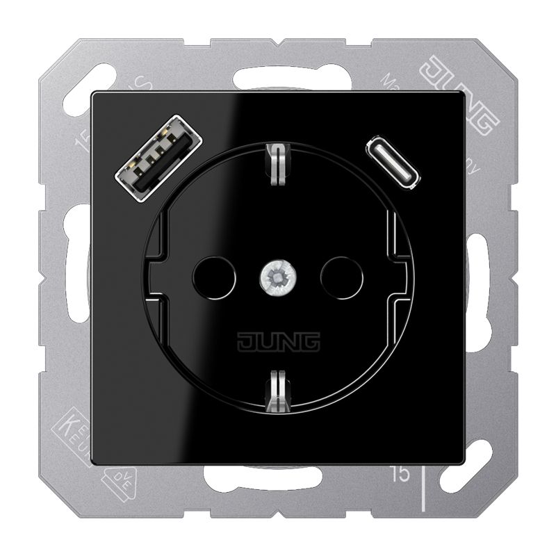 Jung SCHUKO Steckdose 16 A 250 V ~, mit USB-Ladegerät 1 x Typ A + 1 x Typ C, Berührungsschutz, Serie A, schwarz A1520-15CASW