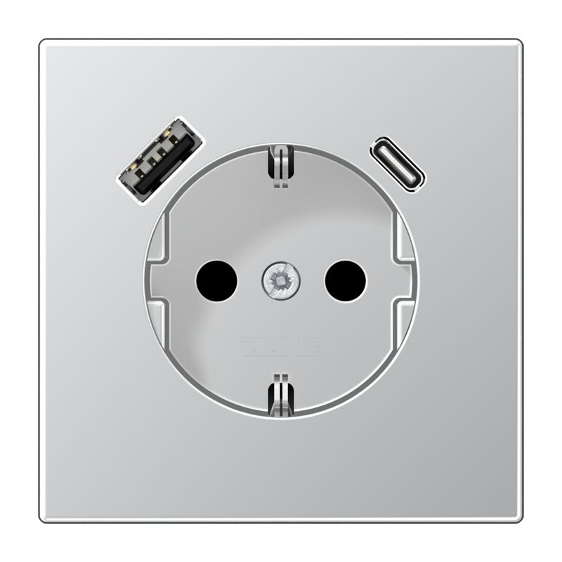 Jung SCHUKO Steckdose 16 A 250 V ~, mit USB-Ladegerät 1 x Typ A + 1 x Typ C, Berührungsschutz, Serie LS, Aluminium (lackiert) AL1520-15CA-L