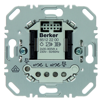 Universal-Schalteinsatz 2fach 2-Draht. Universal-Schalteinsatz 2-fach, niedriger Eigenenergiebedarf, automatische Einstellung der minimalen Starthelligkeit für 230 V LED- und Energiesparlampen, lampenschonender Softanlauf, Phasenan- oder Phasenabschnitt pro Serie je nach Lastart, selbstlernend, kurzschlussfest und überlastsicher (elektronische Sicherung), optionale Feineinstellung der Lastart, mit 2 Nebenstelleneingängen für Taster (Schließer) mit Einflächenbedienung, auch geeignet für das Aufstecken passender KNX Funk Aufsätze, erweiterbar durch Universal-Leistungszusätze Plus REG, keine leitende Verbindung zwischen Tragring und Spreizkrallen, mit Schraubklemmen.