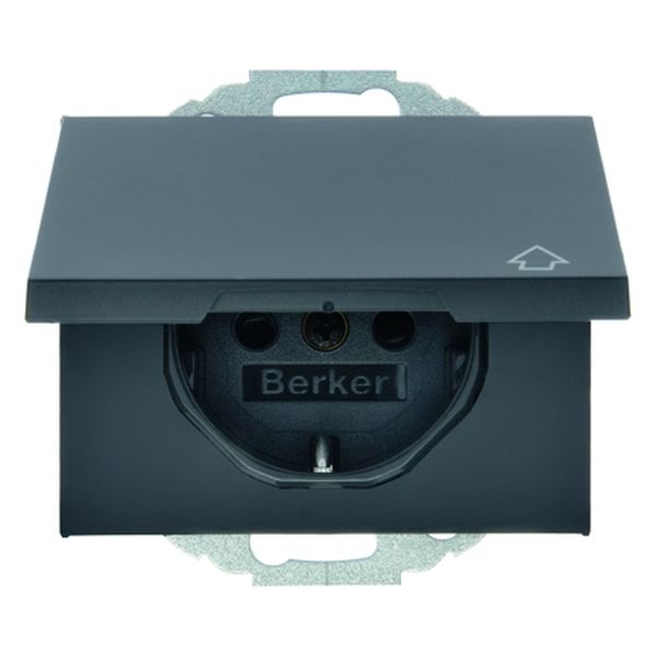 Steckdose SCHUKO m. Klappdeckel u. erh_htem BerŸhrungsschutz K.1 anthrazit, matt. Steckdose SCHUKO¨ verdrehbar mit Klappdeckel, arretiert im ge_ffneten Zustand. FŸr senkrechte und waagerechte Montage, mit Aufdruck, mit erh_htem BerŸhrungsschutz, Steckdose in 45 Grad Schritten verdrehbar, mit Steckklemmen, mit einteiligem ErdungsbŸgel. Unterputz-Installation, Fl_chenprogramm. Material: Kunststoff, Thermoplast, bruchsicher, halogenfrei.
