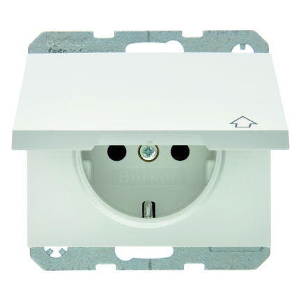 Steckdose SCHUKO mit selbstschl. Klappdeckel u. erh.BS K.1 polarwei§, gl_nzend. Steckdose SCHUKO¨ mit selbstschlie§endem Klappdeckel, mit Aufdruck, mit erh_htem BerŸhrungsschutz, mit Steckklemmen nach VDE 0620 als Verbindungsklemmen ausgefŸhrt und genehmigt, mit einteiligem ErdungsbŸgel. Unterputz-Installation, Fl_chenprogramm. Material: Kunststoff, Thermoplast, bruchsicher, hochgl_nzende Oberfl_che, halogenfrei.