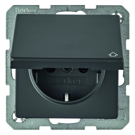 Steckdose SCHUKO mit Klappdeckel u. erh.BS Q.1/Q.3 anthrazit, samt. Steckdose SCHUKO® mit zufallendem Klappdeckel, mit erhöhtem Berührungsschutz, mit Aufdruck, mit Steckklemmen nach VDE 0620 als Verbindungsklemmen ausgeführt und genehmigt, mit einteiligem Erdungsbügel. Unterputz-Installation, Flächenprogramm. Material: Kunststoff, Thermoplast, bruchsicher, halogenfrei.
