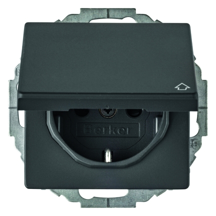 Steckdose SCHUKO mit Klappdeckel u. erh.BS Q.1/Q.3 anthrazit, samt. Steckdose SCHUKO® verdrehbar mit zufallendem Klappdeckel für senkrechte und waagerechte Montage, mit Aufdruck, mit erhöhtem Berührungsschutz, Einbaulage des Einsatzes in 45-Grad Schritten verdrehbar, mit Steckklemmen, mit einteiligem Erdungsbügel. Unterputz-Installation, Flächenprogramm. Material: Kunststoff, Duroplast, halogenfrei.