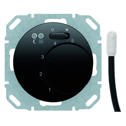 Fu§bodentemp.-Regler m. Schlie§er, Z.-Stk., Wippsch., R.1/R.3 schwarz, gl_nzend. Fu§bodentemperaturregler mit Schlie§er, ZentralstŸck, Wippschalter, 2 LED und Fu§bodentemperaturfŸhler, mit Aufdruck, Regulierknopf mit Temperaturbereichsbegrenzung, mit Ein-/Ausschalter und 2 LED, mit LED fŸr Heizen und LED fŸr Nachtabsenkung, mit separatem Anschluss fŸr Nachtabsenkung, inklusive Fu§bodentemperaturfŸhler, z.B. fŸr Stellantriebe stromlos geschlossen, ohne Spreizkrallen, mit Steckklemmen, Neutralleiter erforderlich, Wird die eingestellte Temperatur unterschritten, schlie§t der Kontakt. Unterputz-Installation, Standardprogramm. Material: Kunststoff, Thermoplast, bruchsicher, halogenfrei.