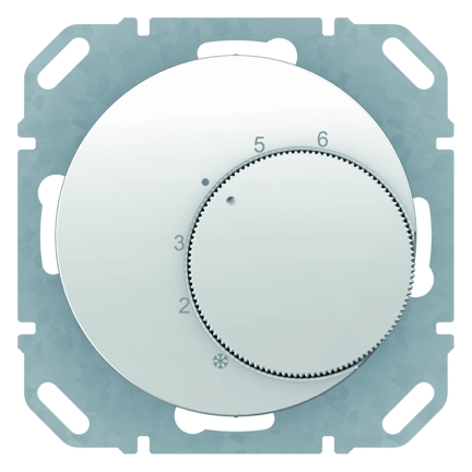 Temperaturregler mit Wechsler und ZentralstŸck R.1/R.3 polarwei§, gl_nzend. Raumtemperaturregler mit Wechsler und ZentralstŸck mit Aufdruck, Regulierknopf mit Temperaturbereichsbegrenzung. FŸr Heiz- oder KŸhlbetrieb, z.B. fŸr Stellantriebe stromlos geschlossen, mit thermischer RŸckfŸhrung, ohne Spreizkrallen, mit Steckklemmen, Neutralleiter erforderlich, wird die eingestellte Temperatur erreicht, wechselt der Kontakt. Unterputz-Installation, Standardprogramm. Material: Kunststoff, Thermoplast, bruchsicher, halogenfrei.