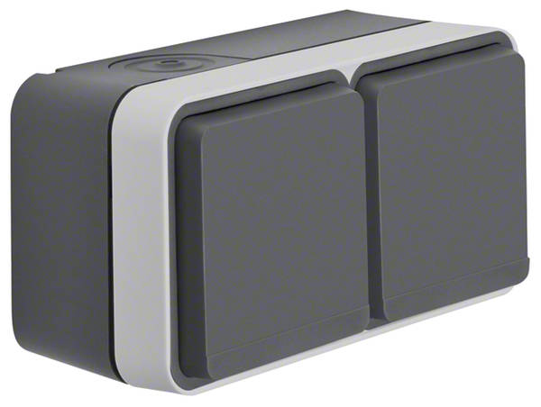 Steckdose SCHUKO 2fach waagerecht mit Klappd., 4 Leitungseinf. AP W.1 grau. Steckdose SCHUKO® 2-fach waagerecht mit Klappdeckel AP, IP55. Für waagerechte Montage, Einsätze durchverdrahtet, mit Steckklemmen, mit einer Einführung für 2 Leitungen und einer Einführung für Leitung oder Rohr, die obere und untere Einführung für Leitungen sind seitlich angeordnet und daher besonders geeignet für die Montage neben Türrahmen o. ä. 2 zusätzliche seitliche Leitungseinführungen, durch die seitlichen Leitungseinführungen besonders geeignet für die Montage über Werkbänke, vollflächige Dichtung unter dem Gehäuseboden zur Abdichtung der Gehäuserückseite, mit zufallendem Klappdeckel, manuell einrastbar, um den Schutzgrad IP55 zu erreichen, gut zugängliche, trichterförmige Montagelöcher in den Gehäusen, eine Wago 2-Leiter Verbindungsklemme für Verdrahtung beiliegend, zwei Einrastplätze für Wago 2-Leiter Verbindungsklemmen im Gehäuseboden, viel Platz zur Verdrahtung unter den Sockeln der Einsätze (Hohlboden), einfache Montage des Einsatzes im Gehäuse durch Einrasten, sichere Fixierung des Rahmens am Gehäuse über Bajonett-Schnellverschluss, Verbindungsklemmen nach VDE 0620-1, Bauart DIN 49440. Gehäuseschrauben und Klappdeckelfedern aus Edelstahl Rostfrei. Aufputz-Installation. Material: Kunststoff, Thermoplast, schlagfest.