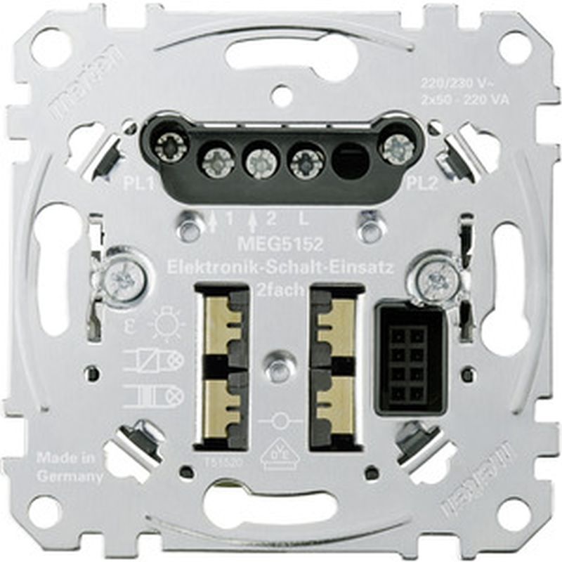 Für ohmsche oder induktive Lasten wie Glühlampen und NV-Halogenbeleuchtung mit konventionellem Trafo. Mit Krallen- und Schraubbefestigung. Mit Schraubklemmen. Funktionen: -Schalten von zwei Ausgängen. Es wird durch das Modul die Art und Weise festgelegt, wie die Funktion des Einsatzes genutzt wird. Externe Ansteuerung über zwei PlusLink Eingänge. Überlast- und kurzschlussfest. Nennspannung: AC 220/230 V, 50/60 Hz. Ausgänge: 2. Schaltleistung pro Kanal: 50-220 VA. Neutralleiter: nicht erforderlich (2 Leitersystem). Anschlussquerschnitt: max. 2x2,5 mm². Zu komplettieren mit: Taster-Modul Basic, 1fach System M MEG5110-0300, System Design MEG5110-60xx Taster-Modul Basic, 2fach System M MEG5120-0300, System Design MEG5120-60xx. Taster-Modul Comfort, 1fach System M MEG5111-0300, System Design MEG5111-60xx Taster-Modul Comfort, 2fach System M MEG5121-0300, System Design MEG5121-60xx Taster-Modul Comfort Plus mit IR, 1fach System M MEG5112-0300. Taster-Modul Comfort Plus, 2fach System M MEG5122-0300. Wiser Taster-Modul, 1fach System M MEG5113-0300, System Design MEG5113-60xx Wiser Taster-Modul, 2fach System M MEG5123-03xx, System Design MEG5123-60xx. Drehregler-Modul System M MEG5252-03xx/-04xx ARGUS 180 UP Sensor-Modul System M MEG5710-03xx/-04xx, System Design MEG5710-60xx ARGUS 180 UP Sensor-Modul mit Schalter System M MEG5711-03xx/-04xx, System Design MEG5711-60xx. ARGUS Präsenz 180/2,20 m UP Sensor-Modul System M MEG5530-03xx/-04xx ARGUS Präsenz Sensor-Modul mit IR MEG5522-00xx Zeitschaltuhr-Modul Standard System M MEG5754-03xx/-04xx. Zeitschaltuhr-Modul System M MEG5755-03xx/-04xx, System Design MEG5755-60xx. Sender: Nebenstelle Plus, 1fach System M MEG5119-0300, System Design MEG5119-60xx Nebenstelle Plus, 2fach System M MEG5129-0300, System Design MEG5129-60xx Zentralstellen-Einsatz MEG5190-0000. Zubehör: PlusLink Verteiler (3 Phasen) MEG5130-0001. PlusLink-Erweiterung MEG5130-0000.