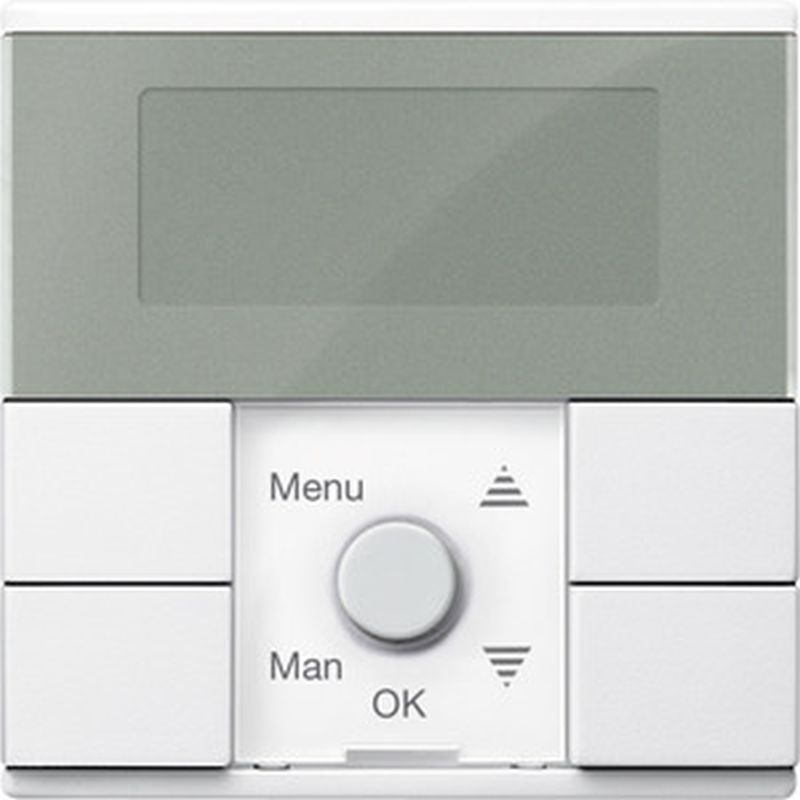 Für System M. Zum programmierten und zeitabhängigen Schalten von Verbrauchern wie Jalousie-/Rollladenmotorenxx Anzahl der Schaltspiele (hoch/runterfahren) Jalousie-Einsätze -Pro Kanal 2 Schaltspiele / Tag. Zentralstellen-Einsatz -Pro PL-Linie 2 Schaltspiele / Tag. Funktionen -Voreingestellte Schaltzeiten (in freien Gruppen). Menügeführte Bedienung -Gangreserve >6 Stunden. Reset zum Rücksetzen auf Werkseinstellung. Zuschaltbarer Zufallsgenerator (im Bereich 0-30 min). Astrofunktion. Einfache Umschaltung Sommer / Winterzeit. Individuelle Laufzeit programmierbar. Manuelle Betätigung jederzeit möglich. Wählbare Pfeiltastenfunktion für Tasten oder globale Szenen. Helligkeitswerte für Sonnenschutzfunktion einstellbar. Verhalten bei Windalarm einstellbar. Lokal Jalousien/Rollladen steuern -Jalousiesteuerungs-Einsatz. Global Jalousien/Rollladen steuern, Szenen aufrufen -Zentralstellen-Einsatz. Bedienelemente 5 Tasten. Anzeigeelemente 5 LED, LCD-Anzeige. Anschluss Modul-Schnittstelle. Zu komplettieren mit Zentralstellen-Einsatz MEG5190-0000. Elektronik-Schalt-Einsatz MEG5151-0000. Elektronik-Schalt-Einsatz, 2fach MEG5152-0000. Relais-Schalt-Einsatz MEG5161-0000. Relais-Schalt-Einsatz, 2fach MEG5162-0000. Jalousiesteuerungs-Einsatz MEG5165-0000. Universal-Dimmer-Einsatz MEG5171-0000. Universal-Dimmer-Einsatz, 2fach MEG5172-0000. Steuerungs-Einsatz 1-10 V MEG5180-0000. DALI-Steuerungs-Einsatz MEG5185-0000. Material Thermoplast edelmatt. Farbe polarweiß.