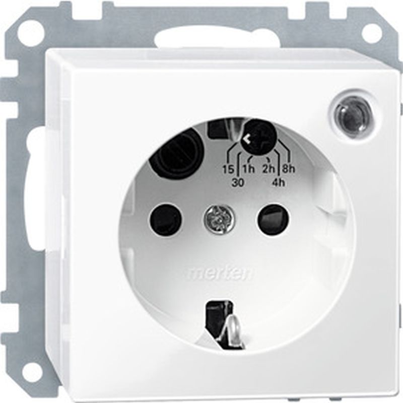Integrierter erh_hter BerŸhrungsschutz gem_§ VDE 0620 Teil 1. Bedienbar Ÿber einen Taster an der Steckdose oder mit einem Nebenstellentaster. Steckdose schaltet nach einer voreinstellbaren Zeit ab. Abschalten vor Ablauf der Zeit m_glich. Mit Schraubbefestigung. Mit Schraubklemmen. Zeiteinstellung: stufig einstellbar, 15 min, 30 min, 1 h, 2 h, 4 h, 8 h. Feinschutz: Elektronischer †berlast-/ Temperaturschutz. Sicherung: 8 A. Anzeigeelemente: grŸne LED fŸr Zustandsanzeige. Nebenstellenbetrieb: Nebenstellen-Einsatz 573999. Nebenstellen-TELE-Einsatz 573998. Adapter: Adapter System M 5184xx Hinweis: Fl_chenbŸndiger Einbau bei Installation in 60er Installationsdose m_glich. Lieferumfang: Mit 2 Schrauben zur Befestigung auf der Installationsdose. Material Thermoplast brillant. Farbe polarwei§ gl_nzend.