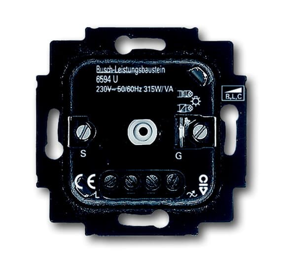 Busch-Dimmer, Leistungserweiterung, UP-Montagedosen und -Einsätze, Einsätze für Busch-Dimmer, Busch-Dimmer, Leistungserweiterung UP, RLC, 200-315 W Die Ansteuerung erfolgt durch einen Busch-Universal-Zentraldimmer 6593 U oder Busch-Universal-Drehdimmer 6591 U-101 Für Glühlampen, 230 V-Halogenglühlampen und Niedervolt-Halogenlampen mit konventionellen oder elektronischen Trafos. Nur einsetzbar in Verbindung mit einer Zentralscheibe 2114-xxx und 6541-xxx. Ohne Zentralscheibe. Nennspannung: , +10 % / -10 % Nennfrequenz: 50 Hz Nennleistung: 200 - 315 W/VA IEC 60669-2-1, British Standard EN 60669-2-1