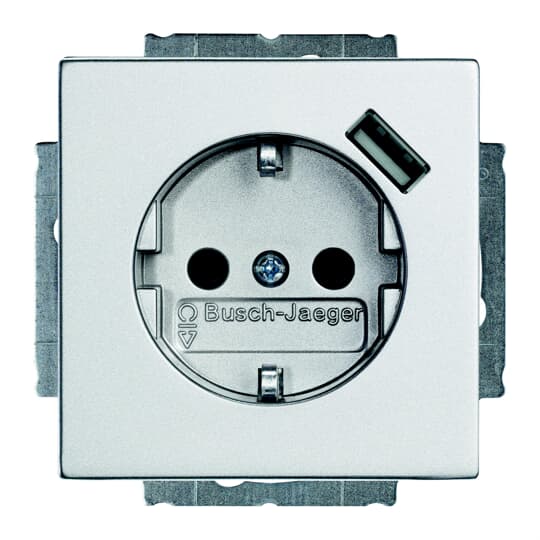 SCHUKO USB-Steckdose, alusilber, Busch-axcent, Steckdosen, SCHUKO USB-Steckdose mit erh. Berührungsschutz Mit Steckanschluss. 2-polig (2 P + E) Zum Laden und Versorgen mobiler Endgeräte über USB-Kabel. Mit USB Typ A Steckbuchse. Mit elektronischem Kurzschlussschutz. Mit elektronischem Überlastschutz. Gleichzeitiges Laden via USB-Anschluss und Nutzung der SCHUKO Steckdose. Sekundär: , +5 % / -5 % Nennfrequenz: 50 Hz Lastart: SCHUKO Steckdose Nennstrom: 16 A Lastart: USB-Anschluss Nennstrom: 700 mA Schutzart Gerät: IP 20, SELV Temperaturbereich Gerät: 5 °C bis 35 °C Maße (H x B x T): 71 mm x 71 mm x 53 mm Einbautiefe: 35 mm