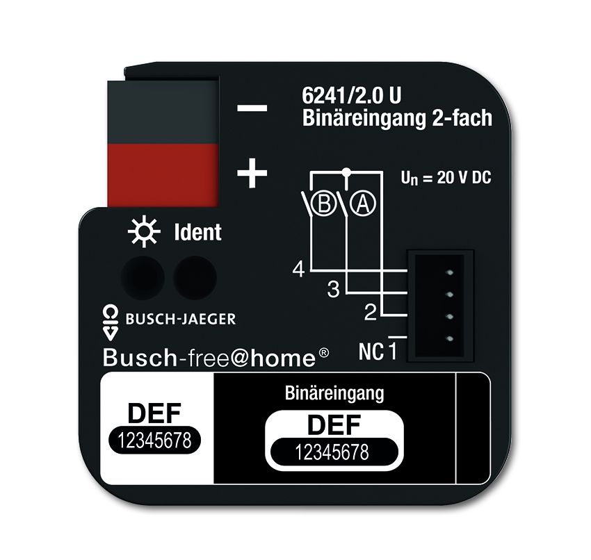 Bin_reingang 2-fach, UP, Busch-free@home, Bin_reing_nge, Bin_reingang 2-fach, UP fŸr Busch-free@home An 2 Kan_len k_nnen konventionelle Taster oder Hilfskontakte angeschlossen werden. Die Information der Kontaktabfrage kann zur Ansteuerung von Busch-free@home Aktoren oder fŸr die Erfassung von Statusinformationen verwendet werden. Die Kontaktabfragespannung wird vom Bin_reingang selbst zur VerfŸgung gestellt. Verl_ngerung der Anschlussleitungen um maximal 10 m m_glich. Unterputz-Ger_t zum Einbau in eine 60 mm Ger_te- oder Verteilerdose. Der Busanschluss erfolgt Ÿber die beiliegende Busklemme. Eing_nge: 2 Schutzart Ger_t: IP 20 Temperaturbereich Ger_t: -5 ¡C bis 45 ¡C Ma§e (H x B x T): 39 mm x 40 mm x 12 mm