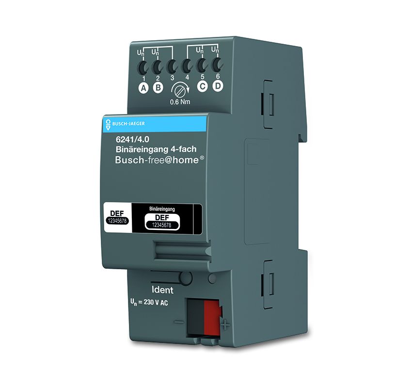 Bin_reingang 4-fach, Busch-free@home, Bin_reing_nge, Bin_reingang 4-fach fŸr Busch-free@home Erfasst Ÿber 4 Kan_le AC/DC-Signale von 10.230 V. Die Information der Signalauswertung kann zur Ansteuerung von Busch-free@home Aktoren oder fŸr die Erfassung von Statusinformationen verwendet werden. Der Busanschluss erfolgt Ÿber die beiliegende Busklemme. Eing_nge: 4 Schutzart Ger_t: IP 20 Temperaturbereich Ger_t: -5 ¡C bis 45 ¡C Ma§e (H x B x T): 90 mm x 36 mm x 64 mm Teilungseinheit: 2 TE