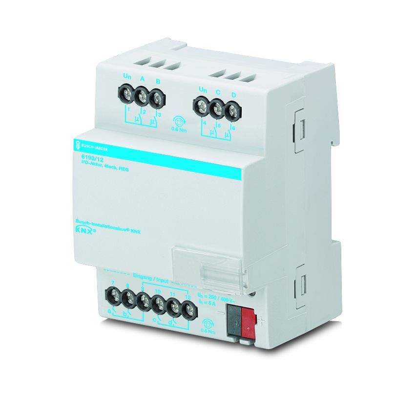 I/O-Aktor, 4-fach, REG, Busch-Installationsbus KNX, REG-Bin_reing_nge, Universal-Ein-/Ausgabe, Analogeing_nge, I/O-Aktor, 4-fach, REG Der I/O-Aktor besitzt 4 Ausg_nge zur Ansteuerung von Beleuchtungsstromkreisen Es stehen 4 potentialfreie Bin_reing_nge zur VerfŸgung zur Bedienung der Ausg_nge. Die Bin_reing_nge k_nnen als reine KNX-Teilnehmer programmiert werden.