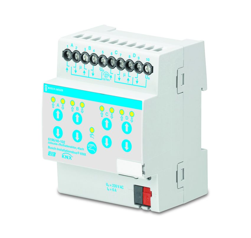 Jalousieaktor, 6 A, Busch-Installationsbus KNX, REG-Jalousieaktoren, Jalousieaktor, 6 A 4-fach 230 V~, 50 Hz, 4 x 6 A Zum Steuern von 4 unabh_ngigen Jalousiegruppen. AnschlŸsse: KNX-Linie: Busanschlussklemme Nennspannung: , +10 % / -15 % Nennfrequenz: 50 Hz/60 Hz Ausg_nge: 4x Umschalter Lastart: AC1/AC3 Nennstrom: 6 A Schutzart Ger_t: IP 20 Temperaturbereich Ger_t: -5 ¡C bis 45 ¡C Ma§e (H x B x T): 90 mm x 72 mm x 64 mm Einbautiefe: 68 mm Teilungseinheit: 4 TE