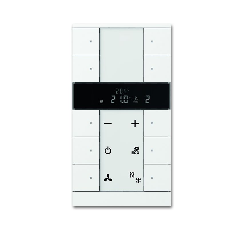 Raumtemperaturregler Nebenstelle mit Bedienfunktion 10-fach, studiowei§, Busch-Installationsbus KNX, ClimaECO Sensoren, Raumtemperaturregler Nebenstelle mit Bedienfunktion 10-fach Frei konfigurierbares Muljpgunktionsbedienelement. Raumtemperaturbedienelement/Reglernebenstelle mit max. 10-fach Bedienelement Mit Beschriftungsfeld. Transparenter Beschriftungsbogen mit Standardsymbolen in der Lieferung enthalten. UnterstŸtzung der KNX-Funktionen durch innovatives Farbkonzept (gelb=Beleuchtung, blau=Jalousie, orange=RTR, magenta=Szene und wei§=neutral/keine Funktionszuordnung) oder Standardbeleuchtung rot/grŸn. Tasterfunktion (Schalten/Dimmen/Jalousie/Wert senden/Lichtszenen/LŸftungsfunktion) Mit integriertem TemperaturfŸhler. Mit Temperaturanzeige IST-Wert Mit Temperaturanzeige SOLL-Wert. Der Busanschluss erfolgt Ÿber die beiliegende Busklemme. Mit integriertem KNX-Busankoppler. Anzahl Busteilnehmer: 1 Bedienelemente: Tastkontakte links/rechts Anzeigeelemente: Anzeige der Betriebsart, Temperatur, FanCoil-Stufe, Feuchtigkeitswert, CO2-Wert, Zeit oder Datum Ÿber LCD AnschlŸsse: KNX-Linie: Busanschlussklemme Schutzart Ger_t: IP 20 Temperaturbereich Ger_t: -5 ¡C bis 45 ¡C Ma§e (H x B x T): 166 mm x 90 mm x 13 mm
