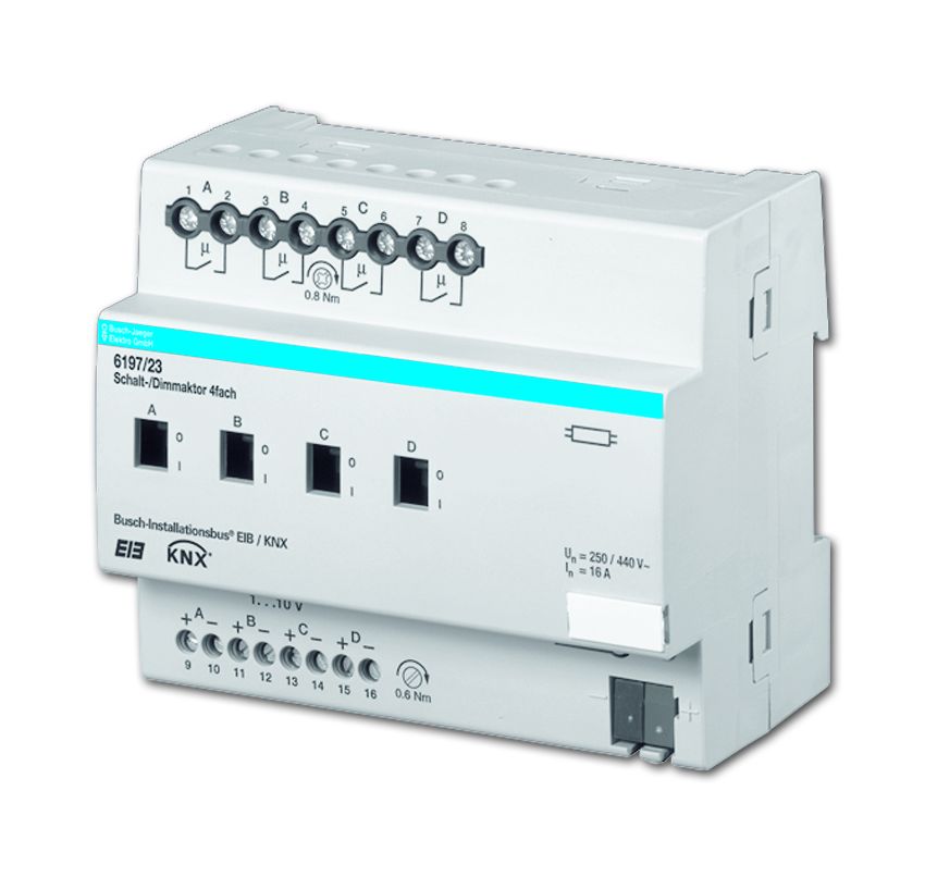 Schalt-/Dimmaktor, Busch-Installationsbus KNX, REG-Schalt-/Dimmaktoren, Schalt-/Dimmaktor 4-fach 4-fach Schalt-/Dimmaktor zum Dimmen von 4 EVG-Gruppen mit 1-10 V Schnittstelle Der Busanschluss erfolgt Ÿber die beiliegende Busklemme. Bedienelemente: Manuelle Bet_tigungsm_glichkeit fŸr EIN/AUS Ÿber Schiebeschalter Anzeigeelemente: Statusanzeige der Ausg_nge Ÿber Position der Schiebeschalter AnschlŸsse: KNX-Linie: Busanschlussklemme Nennspannung: , +10 % / -15 % Nennfrequenz: 50 Hz/60 Hz Ausg_nge: 4x Schlie§er, potenzialfrei Lastart: AC1 Nennstrom: 10 A, bei cos ? 1 Ausgangsspannung: 230 V~ Lastart: AC3 Nennstrom: 8 A, bei cos ? 0,65 Ausgangsspannung: 230 V~ Steuer-/Signalausg_nge: 4, 0-10 V (passiv) Nennstrom: 100 mA Schutzart Ger_t: IP 20 Temperaturbereich Ger_t: -5 ¡C bis 45 ¡C Ma§e (H x B x T): 90 mm x 108 mm x 64 mm Einbautiefe: 68 mm Teilungseinheit: 6 TE