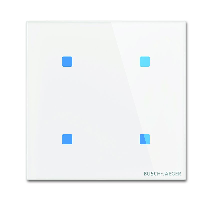Touch-Bedienelement, 4-fach, Busch-Installationsbus KNX, Busch-tacteo, Touch-Bedienelement, 4-fach Standard Ger_t Bestellung nur in Verbindung mit der Design ID m_glich. Mit integriertem KNX-Busankoppler. Mit integriertem TemperaturfŸhler. Tasterfunktion: Schalten / Dimmen / Jalousie /Wert senden / Lichtszenen u.a. UnterstŸtzung der KNX-Funktionen durch innovatives Farbkonzept (gelb=Beleuchtung, blau=Jalousie, orange=RTR, magenta=Szene und wei§=neutral/keine Funktionszuordnung) oder Standardbeleuchtung rot/grŸn. Der Busanschluss erfolgt Ÿber die beiliegende Busklemme. Anzahl Busteilnehmer: 1 Bedienelemente: frei programmierbare Touchfl_chen Anzeigeelemente: LED zur Anzeige des Schaltzustandes Schutzart Ger_t: IP 20 Temperaturbereich Ger_t: -5 ¡C bis 45 ¡C Ma§e (H x B x T): 86 mm x 86 mm