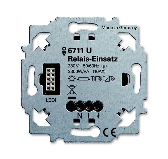 Universal-Relais-Einsatz ZigBee Light Link, Fernsteuerung, ZigBee Light Link Unterputz-Eins_tze/Zwischenstecker, Universal-Relais-Einsatz ZigBee Light Link Zum Schalten elektrischer Lasten per Funk. 3-Leiter-Anschlusstechnik (Neutralleiter erforderlich). Zum Schalten von Retrofit-LED-Leuchtmitteln (LEDi). Zum Schalten von GlŸhlampen, 230 V-HalogenglŸhlampen, Leuchtstofflampen und Niedervolt-Halogenlampen, die Ÿber Transformatoren betrieben werden. Ohne Bedienelement. FŸr Bedienelement ZigBee Light Link 6735-xxx, 6736-xxx und 6737-xxx. Nennspannung: , +10 % / -10 % Nennfrequenz: 50 Hz/60 Hz Ausg_nge: 1x Schlie§er, potenzialgebunden Lastart: ohmisch, kapazitiv und induktiv Nennstrom: 10 AX Nennleistung: 2300 W/VA Lastart: LEDi und Energiesparlampen, typisch Nennleistung: 100 VA Schutzart Ger_t: IP 20 Temperaturbereich Ger_t: -5 ¡C bis 45 ¡C Einbautiefe: 33 mm IEC 60669-2-1, British Standard EN 60669-2-1