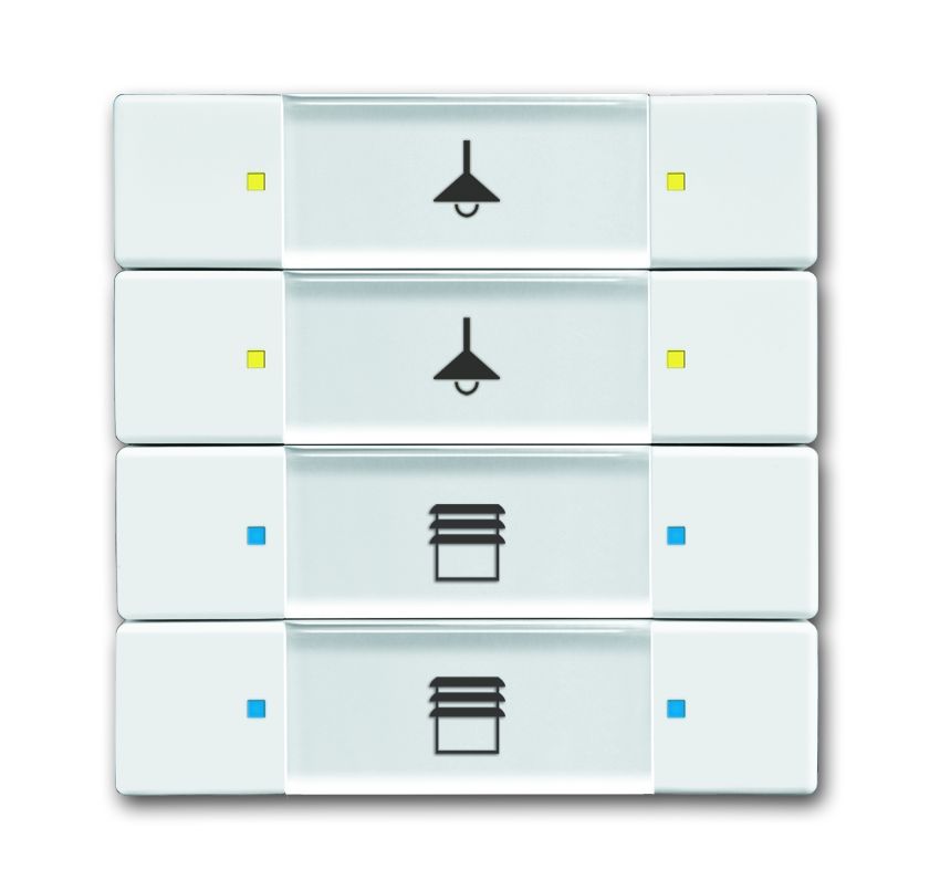 Bedienelement, 4/8-fach, studiowei§, Busch-Powernet KNX, Bedienelemente solo, Bedienelement, 4/8-fach Muljpgunktion/Farbkonzept FŸr Busch-Installationsbus KNX 6120/12-101, 6120/13 und Busch-Powernet KNX 6920/12, 6920/13 und 6920/40. Mit Beschriftungsfeld. UnterstŸtzung der KNX-Funktionen durch innovatives Farbkonzept (gelb=Beleuchtung, blau=Jalousie, orange=RTR, magenta=Szene und wei§=neutral/keine Funktionszuordnung) oder Standardbeleuchtung rot/grŸn. Tasterfunktion: Schalten / Dimmen / Jalousie /Wert senden / Lichtszenen u.a. Transparenter Beschriftungsbogen mit Standardsymbolen in der Lieferung enthalten. Inkl. 10 Logikkan_len (Lichtszenenaktor, Sequenzaktor, Logikgatter etc.). Bedienelemente: Tastkontakte links/rechts Anzeigeelemente: LED zur Anzeige des Schaltzustandes Schutzart Ger_t: IP 20 Temperaturbereich Ger_t: -5 ¡C bis 45 ¡C Ma§e (H x B x T): 63 mm x 63 mm