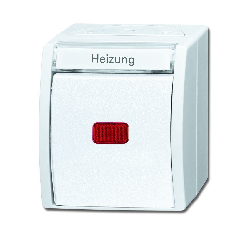 Wippkontrollschalter/Heizungsschalter, alpinwei§, Aufputz IP 44, ocean (IP 44), Wippkontrollschalter/Heizungsschalter Ausschaltung, 2-polig Mit roter Kalotte. Mit Glimmlampe. Mit Beschriftungsfeld. Beschriftungsfeld 57,8 x 9,8 mm Nennstrom: 16 AX Schutzart Ger_t: IP 44