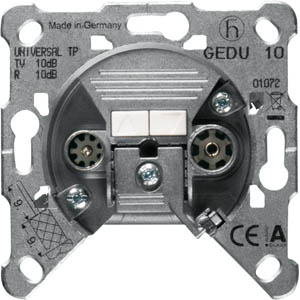 2-Loch Super-Breitband-Dose - Durchgangsdose für Baumstrukturen - 2-Loch Universaldose mit durchgängigen Frequenzbändern für TV/RF und Sat, daher flexibel und zukunftssicher - geeignet für BK- und SAT-ZF-Hausverteilanlagen - 2 gleichberechtigte Auslässe für diverse Endgeräte - rückkanaltauglich - fernspeisetauglich über TV-Auslass (nur EDU 04 F)